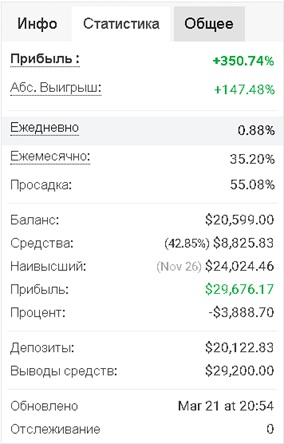 147% — это абсолютный доход, полученный за указанный период. На скриншоте также отображается показатель “Прибыль” (350%), который показывает, каким бы был процент дохода, если бы вы не выводили средства с торгового счета в процессе торговли.