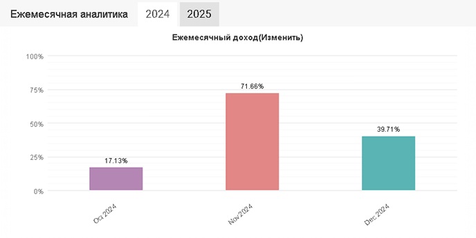 Здесь видно прибыль по месяцам. При этом не ислючено, что будет месяц с прибылью -99,9%. Для того, чтобы этого не произошло, настоятельно рекомендуем еженедельно выводить полученный доход
